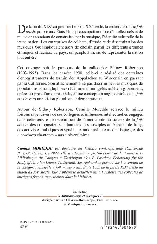 De la fin du XIXe au premier tiers du XXe siècle, la recherche d'une folk music propre aux États-Unis préoccupait nombre d'intellectuels et de musiciens soucieux de construire, par la musique, l'identité culturelle de la jeune nation. Les entreprises de collecte, d'étude et de dissémination des musiques folk impliquaient alors de choisir, parmi les différents groupes ethniques et raciaux du pays, un peuple à même de représenter la nation tout entière. Cet ouvrage suit le parcours de la collectrice Sidney Robertson (1903-1995). Son attachement à ne pas discriminer les musiques de populations non anglophones récemment immigrées reflète le glissement, opéré sur près d'un demi-siècle, d'une conception anglocentrée de la folk music vers une vision pluraliste et démocratique. Autour de Sidney Robertson, Camille Moreddu retrace le milieu foisonnant et divers de ses collègues et influences intellectuelles engagés dans cette oeuvre de redéfinition de l'américanité au travers de la folk music, des compositeurs indianistes aux disciples américains de Jung, des activistes politiques et syndicaux aux producteurs de disques, et des cowboys chantants aux universitaires.