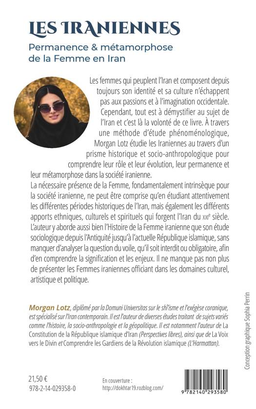 À travers une méthode d'étude phénoménologique, Morgan Lotz étudie les Iraniennes au travers d'un prisme historique et socio-anthropologique pour comprendre leur rôle et leur évolution, leur permanence et leur métamorphose dans la société iranienne. La nécessaire présence de la Femme, fondamentalement intrinsèque pour la société iranienne, ne peut être comprise qu'en étudiant attentivement les différentes périodes historiques de l'Iran, mais également les différents apports ethniques, culturels et spirituels qui forgent l'Iran du XXIe siècle. L'auteur y aborde aussi bien l'Histoire de la Femme iranienne que son étude sociologique depuis l'Antiquité jusqu'à l'actuelle République islamique, sans manquer d'analyser la question du voile, qu'il soit interdit ou obligatoire, afin d'en comprendre la signification et les enjeux. Il ne manque pas non plus de présenter les Femmes iraniennes officiant dans les domaines culturel, artistique et politique.
