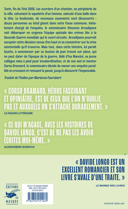 Turin, fin de l’été 2008. Sur un chantier ferroviaire, les ossements de femmes et d’hommes sont découverts. Douze au total, tous tués de la même façon, d’un coup sur la nuque. Une fosse commune, donc. Du moins, c’est l’idée que s’en fait le commissaire Vincenzo Arcadipane, avant que l’équipe spéciale responsable des crimes liés à la Seconde Guerre mondiale s’empare de l’affaire et le court-circuite. Arcadipane pourrait accepter cette décision venue d’en haut et se concentrer sur la crise existentielle qu’il traverse. Mais tout, dans cette histoire, lui paraît louche, à commencer par ce bouton de jean trouvé sur place, qui ne peut dater de l’époque de la guerre. Aidé d’Isa Mancini, sa jeune collègue mise à pied pour insubordination, et de son ami et mentor Corso Bramard, le commissaire décide de mener une enquête parallèle en creusant et remuant le passé, jusqu’à découvrir l’impensable.