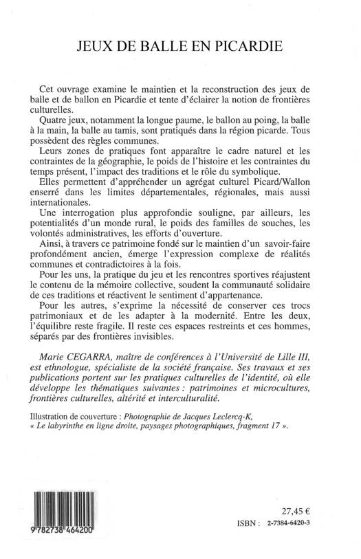 Cet ouvrage examine le maintien et la reconstruction des jeux de balle et de ballon (la longue paume, le ballon au poing, la balle à la main, la balle au tamis) dans la région picarde et tente d'éclairer la notion de frontières culturelles.