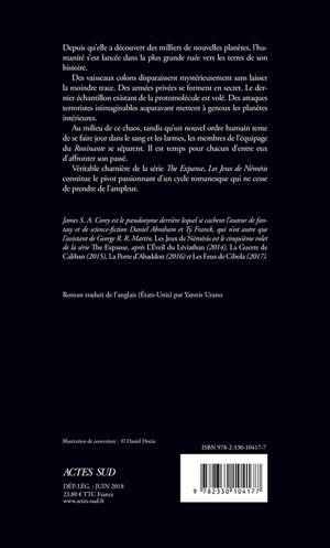 Depuis qu'elle a découvert des milliers de nouvelles planètes, l'hu-manité s'est lancée dans la plus grande ruée vers les terres de son histoire. Des vaisseaux colons disparaissent mystérieusement sans laisser la moindre trace. Des armées privées se forment en secret. Le der-nier échantillon existant de la protomolécule est volé. Des attaques terroristes inimaginables auparavant mettent à genoux les planètes intérieures. Au milieu de ce chaos, tandis qu'un nouvel ordre humain tente de se faire jour dans le sang et les larmes, les membres de l'équipage du Rossinante se séparent. Il est temps pour chacun d'entre eux d'affronter son passé. Véritable charnière de la série The Expanse, Les Jeux de Némésis constitue le pivot passionnant d'un cycle romanesque qui ne cesse de prendre de l'ampleur.