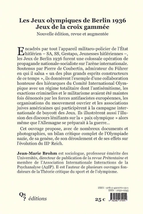 Encadrés par tout l’appareil militaro-policier de l’État hitlérien – SA, SS, Gestapo, Jeunesses hitlériennes –, les Jeux de Berlin 1936 furent une colossale opération de propagande nationale-socialiste sur l’arène internationale. Soutenus par Pierre de Coubertin, admirateur du Führer en qui il salua « un des plus grands esprits constructeurs de ce temps », ils donnèrent l’exemple d’une collaboration honteuse des hiérarques du Comité International Olympique avec un régime totalitaire dont l’antisémitisme, les exactions criminelles et le militarisme avaient été maintes fois dénoncés par les forces antifascistes européennes, les organisations du mouvement ouvrier et les associations juives américaines qui participèrent à la campagne internationale de boycott des Jeux. Ils illustrèrent aussi l’illusion des discours lénifiants sur la « paix olympique » alors même que l’Allemagne se préparait à la guerre… Cet ouvrage propose, avec de nombreux documents et photographies, un bilan critique complet de l’Olympiade nazie, de sa genèse, de son déroulement et de ses effets sur l’évolution du IIIe Reich.