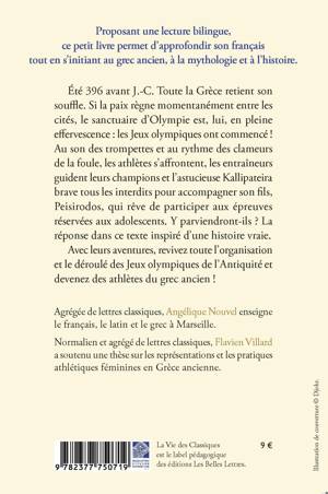 Au son des trompettes et au rythme des clameurs de la foule, les athlètes s’affrontent, les entraîneurs guident leurs champions et l’astucieuse Kallipateira brave tous les interdits pour accompagner son fils, Peisirodos, qui rêve de participer aux épreuves réservées aux adolescents. Y parviendront-ils ? La réponse dans ce texte inspiré d’une histoire vraie.