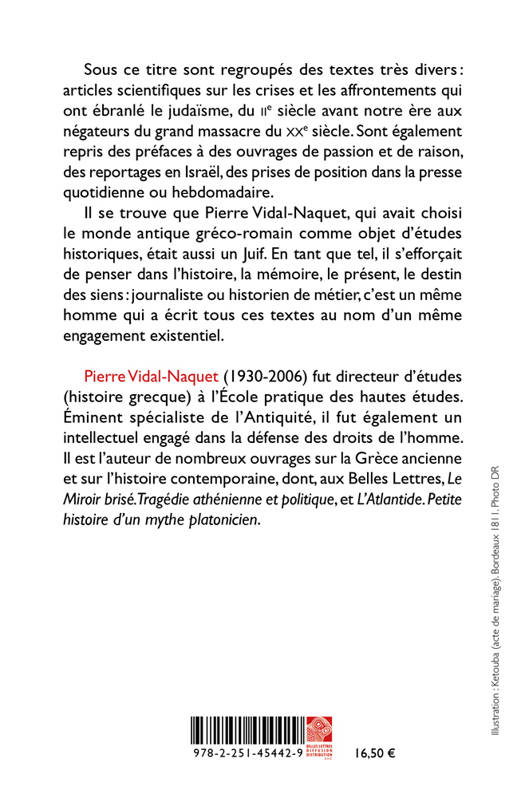 Sous ce titre sont regroupes des textes tres divers: articles scientifiques sur les crises et les affrontements qui ont ebranle le judaisme, du IIe siecle avant notre ere aux negateurs du grand massacre du XXe siecle. Sont egalement repris des prefaces a des ouvrages de passion et de raison, des reportages en Israel, des prises de position dans la presse quotidienne ou hebdomadaire. Il se trouve que Pierre Vidal-Naquet, qui avait choisi le monde antique greco-romain comme objet d'etudes historiques, etait aussi un Juif. En tant que tel, il s'efforcait de penser dans l'histoire, la memoire, le present, le destin des siens: journaliste ou historien de metier, c'est un meme homme qui a ecrit tous ces textes au nom d'un meme engagement existentiel.