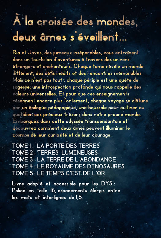 À la croisée des mondes, deux âmes s'éveillent... Ria et Javes, des jumeaux inséparables, vous entraînent dans un tourbillon d'aventures à travers des univers étrangers et enchanteurs. Chaque tome révèle un monde différent, des défis inédits et des rencontres mémorables. Mais ce n'est pas tout : chaque périple est une quête de sagesse, une introspection profonde qui nous rappelle des valeurs universelles. Et pour que ces enseignements résonnent encore plus fortement, chaque voyage se clôture par un épilogue pédagogique, une boussole pour cultiver au quotidien ces précieux trésors dans notre propre monde. Embarquez dans cette odyssée transcendantale et découvrez comment deux âmes peuvent illuminer le cosmos de leur curiosité et de leur courage.