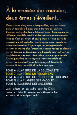 À la croisée des mondes, deux âmes s'éveillent... Ria et Javes, des jumeaux inséparables, vous entraînent dans un tourbillon d'aventures à travers des univers étrangers et enchanteurs. Chaque tome révèle un monde différent, des défis inédits et des rencontres mémorables. Mais ce n'est pas tout : chaque périple est une quête de sagesse, une introspection profonde qui nous rappelle des valeurs universelles. Et pour que ces enseignements résonnent encore plus fortement, chaque voyage se clôture par un épilogue pédagogique, une boussole pour cultiver au quotidien ces précieux trésors dans notre propre monde. Embarquez dans cette odyssée transcendantale et découvrez comment deux âmes peuvent illuminer le cosmos de leur curiosité et de leur courage.