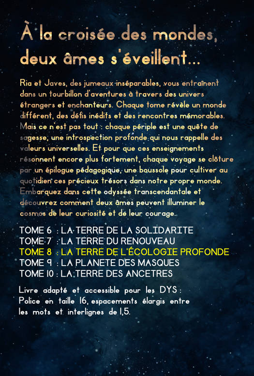 Le huitième tome des Jumeaux du Multivers, intitulé "La Terre de l'Écologie Profonde", nous transporte dans une aventure où Ria et Javes découvrent un monde où la symbiose avec la nature est au cœur de l'existence. Ce récit met en lumière des thèmes tels que la sagesse ancestrale, le respect mutuel entre toutes les formes de vie et l'équilibre délicat entre l'humanité et la nature. À travers leur périple, les jumeaux apprennent l'importance de l'harmonie avec l'environnement et sont dotés de dons uniques qui leur permettent de dialoguer avec le règne végétal, d'influencer les créatures du monde animal et de guérir les terres endommagées. Ce tome, comme les précédents, se clôture par un épilogue pédagogique qui vise à approfondir la réflexion sur les valeurs universelles et le respect de la nature, faisant de cette collection un outil idéal pour l'enseignement et l'éveil des jeunes esprits à l'écologie et à la coexistence pacifique. Avec une mise en page adaptée pour les dyslexiques, chaque livre de cette collection est conçu pour être accessible à tous. (lecture facile)