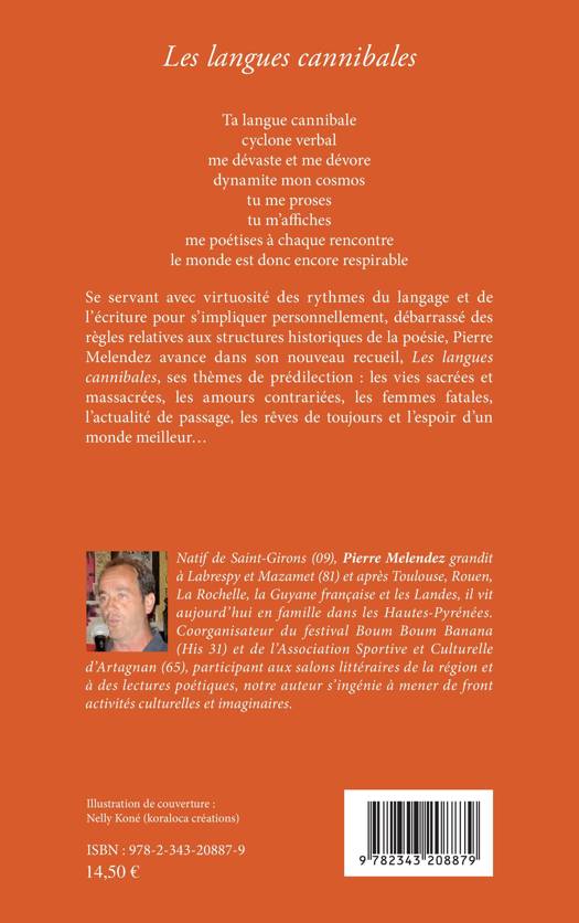 Se servant avec virtuosité des rythmes du langage et de l'écriture pour s'impliquer personnellement, débarrassé des règles relatives aux structures historiques de la poésie, Pierre Melendez avance dans son nouveau recueil, Les langues cannibales, ses thèmes de prédilection : les vies sacrées et massacrées, les amours contrariées, les femmes fatales, l'actualité de passage, les rêves de toujours et l'espoir d'un monde meilleur.