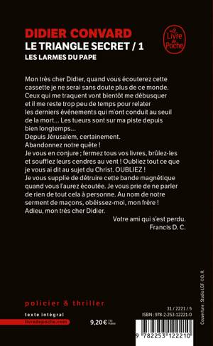 Mon très cher Didier, quand vous écouterez cette cassette, je ne serai sans doute plus de ce monde. Ceux qui me traquent vont bientôt me débusquer et il me reste trop peu de temps pour relater les derniers événements qui m’ont conduit au seuil de la mort… Les tueurs sont sur ma piste depuis bien longtemps… Depuis Jérusalem, certainement.