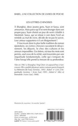 S'inscrivant dans la plus belle tradition du roman épistolaire, Les Lettres chinoises racontent le déracinement, les départs, le choc des cultures et les amours impossibles. Ces lettres, où tous les mots sont permis, sauf ceux de la vérité, sont traversées par une inquiétude fondamentale, celle qui s'empare de l'âme lorsqu'elle prend la mesure de sa profondeur.