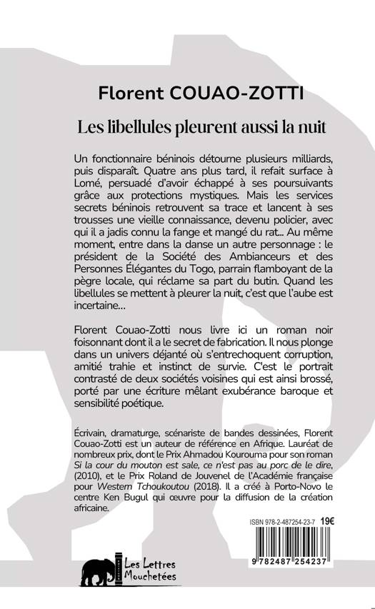 Un fonctionnaire béninois détourne plusieurs milliards, et disparait. Quatre ans plus tard, il refait surface à Lomé, persuadé d’avoir échappé à ses poursuivants grâce aux protections mystiques. Mais les services secrets béninois retrouvent sa trace et lancent à ses trousses une vieille connaissance, devenu policier, avec qui il a jadis connu la fange et mangé du rat... Au même moment, entre dans la danse un autre personnage : le président de la Société des Ambianceurs et des Personnes Élégantes du Togo, parrain flamboyant de la pègre locale, qui réclame sa part du butin. Quand les libellules se mettent à pleurer la nuit, c’est que l’aube est incertaine…