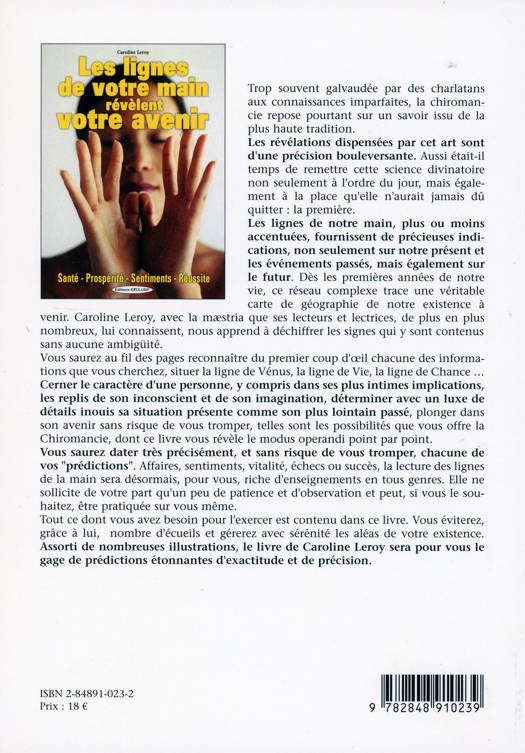 Les lignes de notre main, plus ou moins accentuées, fournissent de précieuses indications, non seulement sur notre présent et les événements passés, mais également sur le futur. Dès les premières années de notre vie, ce réseau complexe trace une véritable carte de géographie de notre existence à venir. Caroline Leroy, avec la maestria que ses lecteurs et lectrices, de plus en plus nombreux, lui connaissent, nous apprend à déchiffrer les signes qui y sont contenus sans aucune ambiguïté. Vous saurez au fil des pages reconnaître du premier coup d'œil chacune des informations que vous cherchez, situer la ligne de Vénus, la ligne de Vie, la ligne de Chance... Cerner le caractère d'une personne, y compris dans ses plus intimes implications, les replis de son inconscient et de son imagination, déterminer avec un luxe de détails inouïs sa situation présente comme son plus lointain passé, plonger dans son avenir sans risque de vous tromper, telles sont les possibilités que vous offre la Chiromancie, dont ce livre vous révèle le modus operandi point par point. Vous saurez dater très précisément, et sans risque de vous tromper, chacune de vos "prédictions". Affaires, sentiments, vitalité, échecs ou succès, la lecture des lignes de la main sera désormais, pour vous, riche d'enseignements en tous genres. Elle ne sollicite de votre part qu'un peu de patience et d'observation et peut, si vous le souhaitez, être pratiquée sur vous même. Tout ce dont vous avez besoin pour l'exercer est contenu dans ce livre. Vous éviterez, grâce à lui, nombre d'écueils et gérerez avec sérénité les aléas de votre existence. Assorti de nombreuses illustrations, le livre de Caroline Leroy sera pour vous le gage de prédictions étonnantes d'exactitude et de précision.