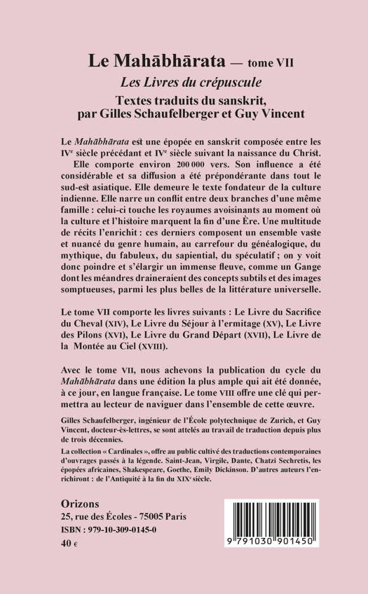 Le Mahabharata est une épopée en sanskrit composée entre les IVe siècle précédant et IVe siècle suivant la naissance du Christ. Elle comporte environ 200 000 vers. Son influence a été considérable et sa diffusion a été prépondérante dans tout le sud-est asiatique. Le tome VII comporte les livres suivants : Le Livre du Sacrifice du Cheval (XIV), Le Livre du Séjour à l'ermitage (XV), Le Livre des Pilons (XVI), Le Livre du Grand Départ (XVII), Le Livre de la Montée au Ciel (XVIII). Avec le tome VII, la publication du cycle du Mahabharata s'achève. Dans une édition la plus ample qui ait été donnée, à ce jour, en langue française.