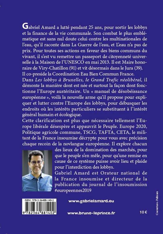 Gabriel Amard a lutté pendant 25 ans, pour sortir les lobbys et la finance de la vie communale. Son combat le plus emblématique est sans nul doute celui contre les multinationales de l’eau, qu’il raconte dans La Guerre de l’eau, et L’eau n’a pas de prix. Pour toutes ses actions en faveur des biens communs du vivant, il s’est vu remettre un passeport de citoyenneté universelle à la Maison de l’UNESCO en mai 2013. Il est maire honoraire de Viry-Châtillon (91) et aujourd'hui Conseiller régional Auvergne-Rhône-Alpes. Dans Les lobbys à Bruxelles, Le Grand Trafic néolibéral, il démonte la manière dont est née et surtout la façon dont fonctionne l’Europe austéritaire. Un « manuel de désobéissance européenne », voilà la nouvelle arme qu’il propose pour expliquer et lutter contre l’Europe des lobbys, pour débusquer les endroits où les intérêts particuliers se substituent à l’intérêt général. Cette clarification est plus que nécessaire tellement l'Europe libérale désespère et appauvri le Peuple. Europe 2020, Politique agricole commune, TSCG, TAFTA, CETA, le militant de la France Insoumise décrypte pour vous avec précision chaque recoin de la novlangue européenne. Il explore chacun des lieux de la domination des marchés, pour que le peuple s’en mêle, pour qu’une remise en cause de ce système puisse avoir lieu et plaide pour l’interdiction des lobbys.