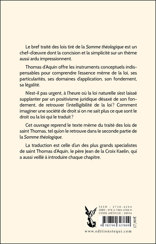 Le bref traité des lois tiré de la Somme théologique est un chef-d'oeuvre dont la concision et la simplicité sur un thème aussi ardu impressionnent. Thomas d'Aquin offre les instruments conceptuels indispensables pour comprendre l'essence même de la loi, ses particularités, ses domaines d'application, son fondement, sa légalité. N'est-il pas urgent, à l'heure où la loi naturelle s'est laissée supplanter par un positivisme juridique désaxé de son fondement, de retrouver l'intelligibilité de la loi ? Comment imaginer une société de droit si on ne sait plus ce qu'est le droit ni la loi qui le traduit ? Cet ouvrage reprend le texte même du traité des lois de saint Thomas, tel qu'on le retrouve dans la seconde partie de la Somme théologique. La traduction est celle du père Jean de la Croix Kaelin, qui a aussi veillé à introduire chaque chapitre.