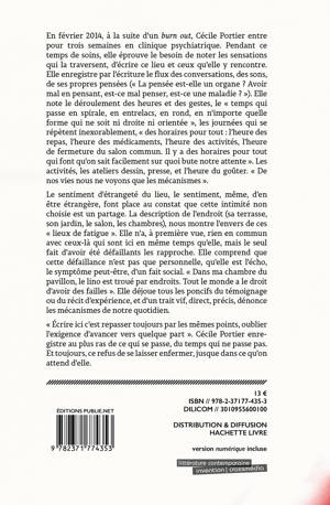 En février 2014, à la suite d’un burn out, Cécile Portier entre pour trois semaines en clinique psychiatrique. Pendant ce temps de soins, elle éprouve le besoin de noter les sensations qui la traversent, d’écrire ce lieu et ceux qu’elle y rencontre. Elle enregistre par l’écriture le flux des conversations, des sons, de ses propres pensées (« La pensée est-elle un organe ? Avoir mal en pensant, est-ce mal penser, est-ce une maladie ? »). Elle note le déroulement des heures et des gestes, le « temps qui passe en spirale, en entrelacs, en rond, en n’importe quelle forme qui ne soit ni droite ni orientée », les journées qui se répètent inexorablement, « des horaires pour tout : l'heure des repas, l'heure des médicaments, l'heure des activités, l'heure de fermeture du salon commun. Il y a des horaires pour tout qui font qu'on sait facilement sur quoi bute notre attente ». Les activités, les ateliers dessin, presse, et l’heure du goûter. « De nos vies nous ne voyons que les mécanismes ».