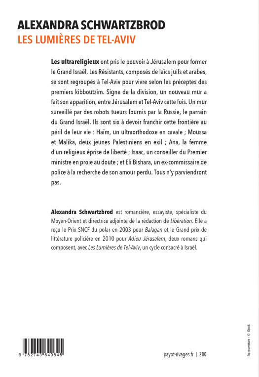 Alexandra Schwartzbrod est romancière, essayiste, spécialiste du Moyen Orient et directrice adjointe de la rédaction de «Libération». Elle a reçu le Prix SNCF du polar en 2003 pour «Balagan» et le Grand prix de littérature policière en 2010 pour «Adieu Jérusalem», deux romans qui composent, avec «Les Lumières de Tel-Aviv», un cycle consacré à Israël.