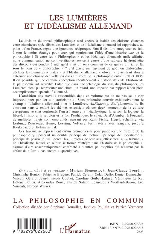 Ces travaux, sans prétendre couvrir exhaustivement le champ "idéalisme allemand" et "lumières, Aufklärung" abordent les thèmes essentiels où ces deux moments de la culture européenne se sont confrontés : la métaphysique, la raison, la logique, la liberté, l'histoire, la religion et la foi, l'esthétique, le sujet. De d'Alembert à Foucault, de multiples trajets sont empruntés passant par Kant, Fichte, Hegel, Schelling, via Leibniz, Rousseau, Hume, Lessing, Voltaire, les matérialistes français, jusqu'à Kierkegaard et Hofmannsthal.