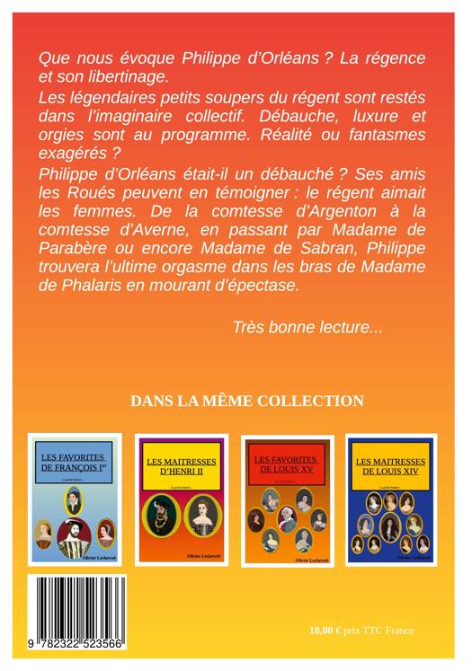 Traiter les galanteries des rois de France par l'humour et l'anecdotique. Voici les grands traits de la petite histoire galante en bande dessinée. Dans ce sixième volume, que nous évoque Philippe d'Orléans ? La régence et le libertinage. Les légendaires petits soupers du régent sont restés dans l'imaginaire collectif. Débauche, luxure et orgies sont au programme. Réalité ou fantasmes exagérés ? Philippe d'Orléans était-il un débauché ? Ses amis, les Roués, peuvent en témoigner : le régent aimait les femmes. De la comtesse d'Argenton à la comtesse d'Averne, en passant par Madame de Parabère ou Madame de Sabran, Philippe trouvera l'ultime orgasme dans les bras de Madame de Phalaris en mourant d'épectase.