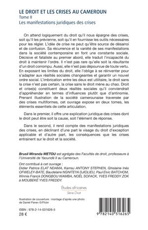 On attend logiquement du droit qu'il nous épargne des crises, soit qu'il les prévienne, soit qu'il en fournisse les outils nécessaires pour les régler. L'idée de crise ne peut qu'être source de désarroi et de confusion. Sa récurrence et la variété de ses manifestations dans la société contemporaine en font une constante sociale. Décisive et fataliste au premier abord, elle traduit l'incapacité du droit à maintenir l'ordre. Il n'est pas rare qu'elle soit la résultante d'un droit corrompu. En exposant les limites du droit, elle l'oblige à se réinventer pour s'adapter aux réalités sociales changeantes et garantir un nouvel ordre social. L'imbrication entre les deux est utilitaire, le droit sans la crise n'est pas certain, la crise sans le droit mène au chao. Prenant illustration de la société camerounaise traversée par des crises multiformes, cet ouvrage expose en deux tomes, les éléments essentiels de cette articulation. Dans le premier, il offre une explication juridique des crises dont le droit peut être soit la cause, soit l'élément de réponse. Dans le second, il rend compte des manifestations juridiques des crises, en déclinant d'une part le visage du droit d'exception applicable et d'autre part, les conséquences que les crises entrainent sur le droit et la société.