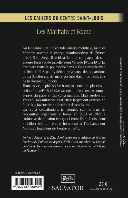 Au lendemain de la Seconde Guerre mondiale, Jacques Maritain accepte la charge d'ambassadeur de France près le Saint-Siège. Il réside à Rome en compagnie de son épouse Raïssa et de sa belle-sÅur Véra de 1945 à 1948. La première visite du philosophe dans la Ville éternelle avait eu lieu en 1918, pour y défendre la cause des apparitions de La Salette , ses derniers voyages datent de 1965, lors de la clôture du Concile. Toute sa vie, le philosophe français a entendu placer son action in medio Ecclesiae, acceptant d'en rendre compte auprès du pape et des congrégations. Mais au-delà du Vatican, son influence s'est aussi largement exercée en Italie à la faveur des traductions de ses livres. Les vingt contributions ici réunies sont le fruit de rencontres organisées à Rome en 2023 et 2024 à l'initiative de l'Institut français Centre Saint-Louis. Leur ambition est de rendre hommage à l'ambassadeur Maritain, fondateur du Centre en 1945.