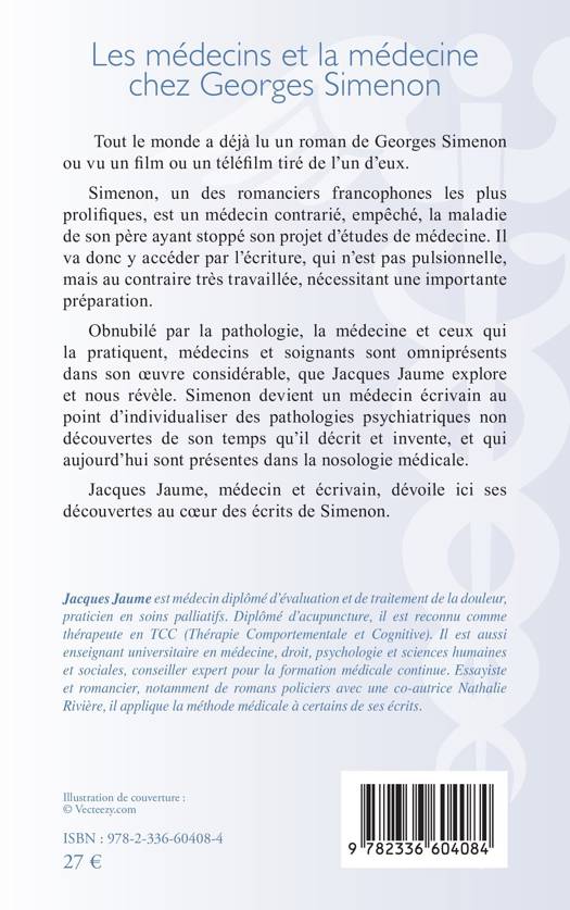 Tout le monde a déjà lu un roman de Georges Simenon ou vu un film ou un téléfilm tiré de l'un d'eux. Simenon, un des romanciers francophones les plus prolifiques, est un médecin contrarié, empêché, la maladie de son père ayant stoppé son projet d'études de médecine. Il va donc y accéder par l'écriture, qui n'est pas pulsionnelle, mais au contraire très travaillée, nécessitant une importante préparation. Obnubilé par la pathologie, la médecine et ceux qui la pratiquent, médecins et soignants sont omniprésents dans son oeuvre considérable, que Jacques Jaume explore et nous révèle. Simenon devient un médecin écrivain au point d'individualiser des pathologies psychiatriques non découvertes de son temps qu'il décrit et invente, et qui aujourd'hui sont présentes dans la nosologie médicale. Jacques Jaume, médecin et écrivain, dévoile ici ses découvertes au coeur des écrits de Simenon.