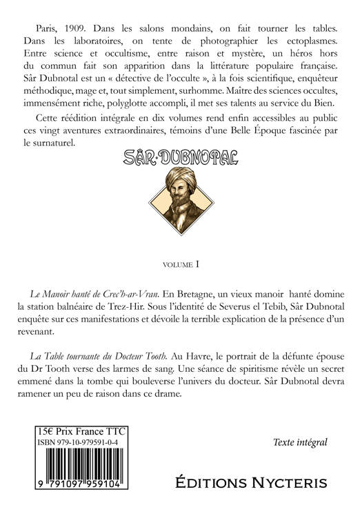 Paris, 1909. Dans les salons mondains, on fait tourner les tables. Dans les laboratoires, on tente de photographier les ectoplasmes. Entre science et occultisme, entre raison et mystère, un héros hors du commun fait son apparition dans la littérature populaire française. Sâr Dubnotal est un « détective de l’occulte », à la fois scientifique, enquêteur méthodique, mage et, tout simplement, surhomme. Maître des sciences occultes, immensément riche, polyglotte accompli, il met ses talents au service du Bien. Cette réédition intégrale en dix volumes rend enfin accessibles au public ces vingt aventures extraordinaires, témoins d’une Belle Époque fascinée par le surnaturel.