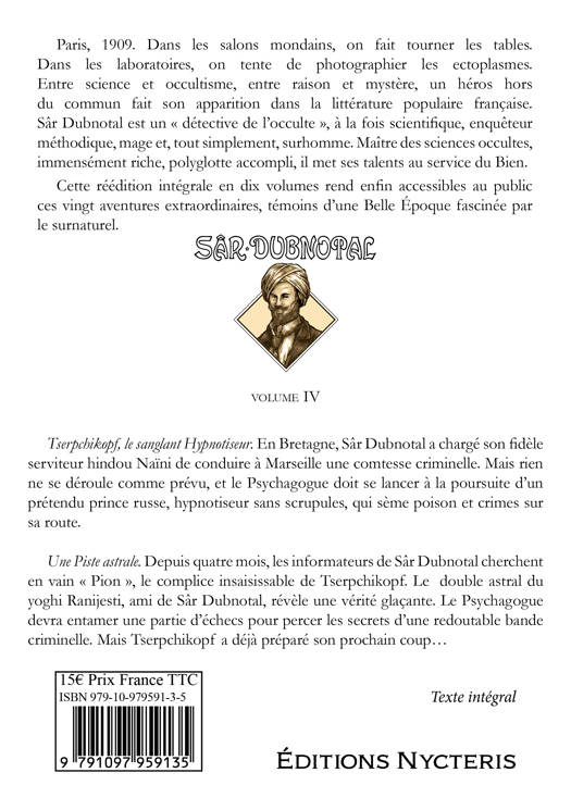 Paris, 1909. Dans les salons mondains, on fait tourner les tables. Dans les laboratoires, on tente de photographier les ectoplasmes. Entre science et occultisme, entre raison et mystère, un héros hors du commun fait son apparition dans la littérature populaire française. Sâr Dubnotal est un « détective de l’occulte », à la fois scientifique, enquêteur méthodique, mage et, tout simplement, surhomme. Maître des sciences occultes, immensément riche, polyglotte accompli, il met ses talents au service du Bien. Cette réédition intégrale en dix volumes rend enfin accessibles au public ces vingt aventures extraordinaires, témoins d’une Belle époque fascinée par le surnaturel.