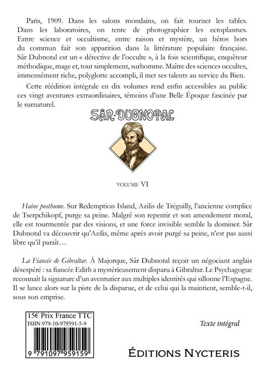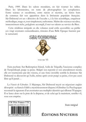 Paris, 1909. Dans les salons mondains, on fait tourner les tables. Dans les laboratoires, on tente de photographier les ectoplasmes. Entre science et occultisme, entre raison et mystère, un héros hors du commun fait son apparition dans la littérature populaire française. Sâr Dubnotal est un « détective de l’occulte », à la fois scientifique, enquêteur méthodique, mage et, tout simplement, surhomme. Maître des sciences occultes, immensément riche, polyglotte accompli, il met ses talents au service du Bien. Cette réédition intégrale en dix volumes rend enfin accessibles au public ces vingt aventures extraordinaires, témoins d’une Belle époque fascinée par le surnaturel.