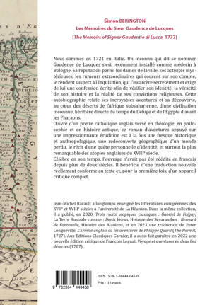Nous sommes en 1721 en Italie. Un inconnu qui dit se nommer Gaudence de Lucques s’est récemment installé comme médecin à Bologne. Sa réputation parmi les dames de la ville, ses activités mystérieuses, les rumeurs extraordinaires qui courent sur son compte, le rendent suspect à l’Inquisition, qui l’incarcère secrètement et exige de lui une confession écrite afin de vérifier son identité, la véracité de son histoire et la réalité de ses convictions religieuses. Cette autobiographie relate ses incroyables aventures et sa découverte, au coeur des déserts de l’Afrique subsaharienne, d’une civilisation inconnue, héritière directe du temps du Déluge et de l’Égypte d’avant les Pharaons. Œuvre d’un prêtre catholique anglais versé en théologie, en philosophie et en histoire antique, ce roman d’aventures appuyé sur une impressionnante érudition est à la fois une fresque historique et anthropologique, une redécouverte géographique d’un monde perdu, le récit d’une quête personnelle d’identité, et surtout la plus remarquable des utopies anglaises du XVIIIe siècle. Célèbre en son temps, l’ouvrage n’avait pas été réédité en français depuis plus de deux siècles. Il bénéficie d’une traduction nouvelle réellement conforme au texte et, pour la première fois, d’un appareil critique complet.