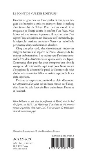 Un chat de gouttière au franc-parler et rompu au langage des humains a pris ses quartiers dans le parking d'un immeuble de Tokyo. Pour rien au monde il ne troquerait sa liberté contre le confort d'un foyer. Mais le jour où une voiture le percute, il est contraint d'accepter l'aide de Satoru, un locataire de l'immeuble, qui le soigne, lui attribue un nom - Nana - et lui offre la perspective d'une cohabitation durable. Cinq ans plus tard, des circonstances imprévues obligent Satoru à se séparer de Nana. Anxieux de lui trouver un bon maître, il se tourne vers d'anciens camarades d'études, disséminés aux quatre coins du Japon. Commence alors pour les deux compères une série de voyages et de retrouvailles qui sont pour Nana autant d'occasions de découvrir le passé de Satoru et de nous révéler - à sa manière féline - maints aspects de la société japonaise. Prenant et surprenant, profond et plein d'humour, Les Mémoires d'un chat est un beau roman sur l'adoption, l'amitié, et la force des liens qui unissent l'homme et l'animal.