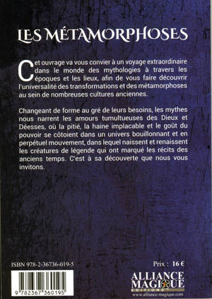 Cet ouvrage va vous convier à un voyage extraordinaire dans le monde des mythologies à travers les époques et les lieux, afin de vous faire découvrir l'universalité des transformations et des métamorphoses au sein de nombreuses cultures anciennes. Changeant de forme au gré de leurs besoins, les mythes nous narrent les amours tumultueuses des Dieux et Déesses, où la pitié, la haine implacable et le goût du pouvoir se côtoient dans un univers bouillonnant et en perpétuel mouvement, dans lequel naissent et renaissent les créatures de légende qui ont marqué les récits des anciens temps. C'est à sa découverte que nous vous invitons.