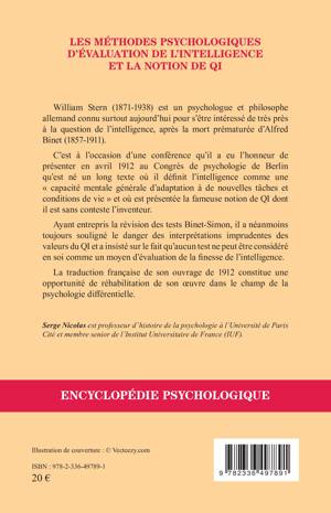 William Stern (1871-1938) est un psychologue et philosophe allemand connu surtout aujourd’hui pour s’être intéressé de très près à la question de l’intelligence, après la mort prématurée d’Alfred Binet (1857-1911). C’est à l’occasion d’une conférence qu’il a eu l’honneur de présenter en avril 1912 au Congrès de psychologie de Berlin qu’est né un long texte où il définit l’intelligence comme une « capacité mentale générale d’adaptation à de nouvelles tâches et conditions de vie » et où est présentée la fameuse notion de QI dont il est sans conteste l’inventeur. Ayant entrepris la révision des tests Binet-Simon, il a néanmoins toujours souligné le danger des interprétations imprudentes des valeurs du QI et a insisté sur le fait qu’aucun test ne peut être considéré en soi comme un moyen d’évaluation de la finesse de l’intelligence. La traduction française de son ouvrage de 1912 constitue une opportunité de réhabilitation de son œuvre dans le champ de la psychologie différentielle.