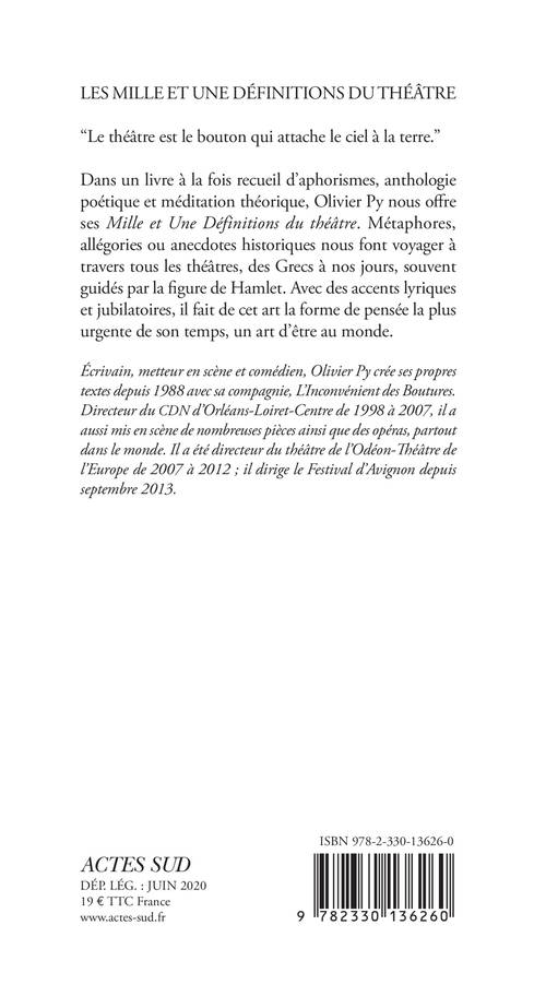 Dans un livre à la fois recueil d'aphorismes, anthologie poétique et méditation théorique, Olivier Py nous offre ses «Mille et Une définition du théâtre». Métaphores, allégories ou anecdotes historiques nous font voyager à travers tous les théâtres, des Grecs à nos jours, souvent guidés par la figure d'Hamlet. Avec des accents lyriques et jubilatoires, il fait de cet art la forme de pensée la plus urgente de son temps, un art d'être au monde.
