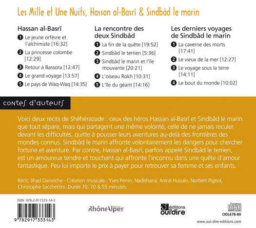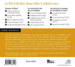 Voici deux récits de Shéhérazade : ceux des héros Hassan al-Basrî et Sindbâd le marin que tout sépare, mais qui partagent une même volonté, celle de ne jamais reculer devant les difficultés, quitte à pousser leurs aventures au-delà des frontières des mondes connus. Sindbâd le marin affronte volontairement les dangers pour chercher fortune et aventure. Par contre, Hassan al-Basrî, parfois appelé Sindbâd le terrien, est un amoureux tendre et touchant qui affronte l'inconnu dans une quête d'amour fantastique. Peu lui importe le prix à payer pour retrouver sa femme et ses enfants.