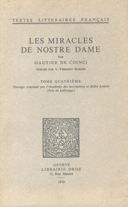 Gautier de Coinci, moine bénédictin du début du XIIIe siècle, est l'un des tout premiers (et un des plus grands) trouvère de langue d'oïl. Son oeuvre est composée de récits de miracles et de chansons, regroupés. A sa mort en 1236, il laisse derrière lui un corpus de près de 30'000 vers, Cet ouvrage, édité par Frédéric Koenig, met pour la premimère fois à disposition du public une des oeuvres capitales de la littérature médiévale.