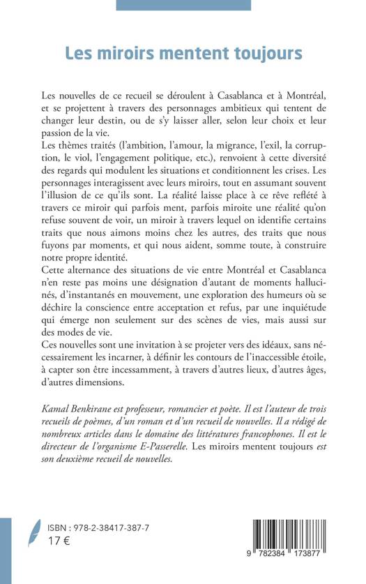 Les nouvelles de ce recueil se déroulent à Casablanca et à Montréal, et se projettent à travers des personnages ambitieux qui tentent de changer leur destin, ou de s'y laisser aller, selon leur choix et leur passion de la vie. Les thèmes traités (l'ambition, l'amour, la migrance, l'exil, la corruption, le viol, l'engagement politique, etc.), renvoient à cette diversité des regards qui modulent les situations et conditionnent les crises. Les personnages interagissent avec leurs miroirs, tout en assumant souvent l'illusion de ce qu'ils sont. La réalité laisse place à ce rêve reflété à travers ce miroir qui parfois ment, parfois miroite une réalité qu'on refuse souvent de voir, un miroir à travers lequel on identifie certains traits que nous aimons moins chez les autres, des traits que nous fuyons par moments, et qui nous aident, somme toute, à construire notre propre identité. Cette alternance des situations de vie entre Montréal et Casablanca n'en reste pas moins une désignation d'autant de moments hallucinés, d'instantanés en mouvement, une exploration des humeurs où se déchire la conscience entre acceptation et refus, par une inquiétude qui émerge non seulement sur des scènes de vies, mais aussi sur des modes de vie. Ces nouvelles sont une invitation à se projeter vers des idéaux, sans nécessairement les incarner, à définir les contours de l'inaccessible étoile, à capter son être incessamment, à travers d'autres lieux, d'autres âges, d'autres dimensions.