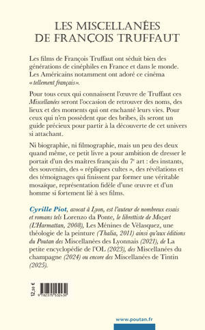 Les films de François Truffaut ont séduit bien des générations de cinéphiles en France et dans le monde. Les Américains notamment ont adoré ce cinéma « tellement français ». Pour tous ceux qui connaissent l’œuvre de Truffaut ces Miscellanées seront l’occasion de retrouver des noms, des lieux et des moments qui ont enchanté leurs vies. Pour ceux qui n’en possèdent que des bribes, ils seront un guide précieux pour partir à la découverte de cet univers si attachant. Ni biographie, ni filmographie, mais un peu des deux quand même, ce petit livre a pour ambition de dresser le portait d’un des maîtres français du 7e art : des instants, des souvenirs, des « répliques cultes », des révélations et des témoignages qui finissent par former une véritable mosaïque, représentation fidèle d’une œuvre et d’un homme si fortement lié à ses films.