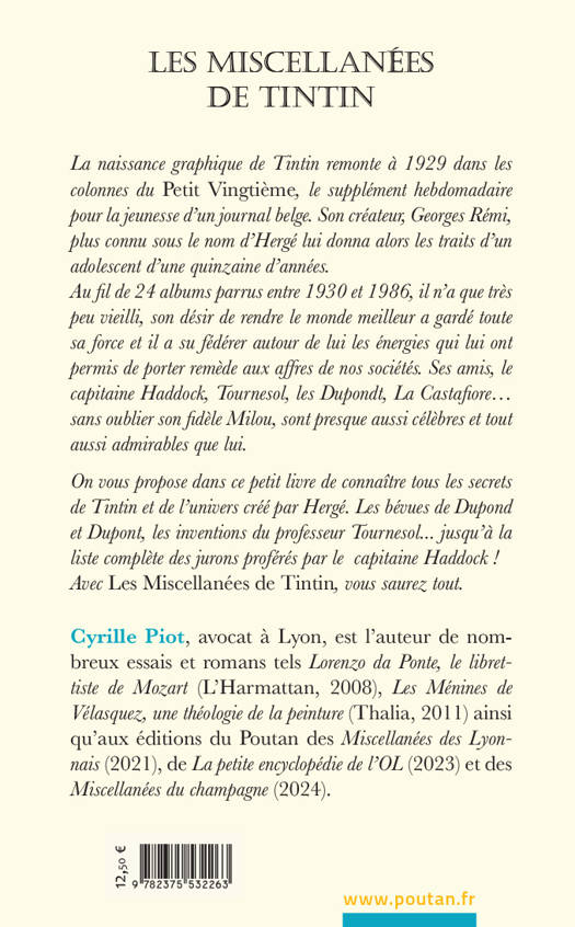 On vous propose dans ce petit livre de connaître tous les secrets de Tintin et de l’univers créé par Hergé. Les bévues de Dupond et Dupont, les inventions du professeur Tournesol... jusqu’à la liste complète des jurons proférés par le capitaine Haddock ! Avec Les Miscellanées de Tintin, vous saurez tout.