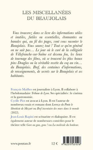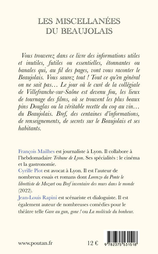 Vous trouverez dans ce livre des informations utiles et inutiles, futiles ou essentielles, étonnantes ou banales qui, au fil des pages, vont vous raconter le Beaujolais. Vous saurez tout ! Tout ce qu’en général on ne sait pas… Le jour où le curé de la collégiale de Villefranche-sur-Saône est devenu fou, les lieux de tournage des films, où se trouvent les plus beaux pins Douglas ou la véritable recette du coq au vin… du Beaujolais. Bref, des centaines d’informations, de renseignements, de secrets sur le Beaujolais et ses habitants.