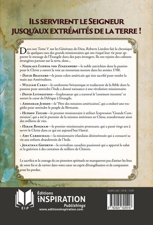 Dans le Tome 5 de la série Les généraux de Dieu, Les missionnaires, Roberts Liardon fait la chronique de quelques-uns des grands missionnaires qui ont risqué leur vie pour apporter le message de l'Évangile dans des pays étrangers. Vous découvrirez les biographies des missionnaires suivants: Nikolaus Ludwig von Zinzendorf - Le renouveau morave David Brainerd - Les amérindiens Hudson Taylor - Chine William Carey - L'Inde Hiram Bingham - Hawaï David Livingstone - L'Afrique Amy Carmichael - Enfants de l'Inde Adoniram Judson - Birmanie Jonathan Goforth - Chine L'auteur parvient remarquablement à nous faire toucher du doigt notre besoin de véritables héros, tout en nous dévoilant les faiblesses, les failles et même les échecs de ces éminents missionnaires.