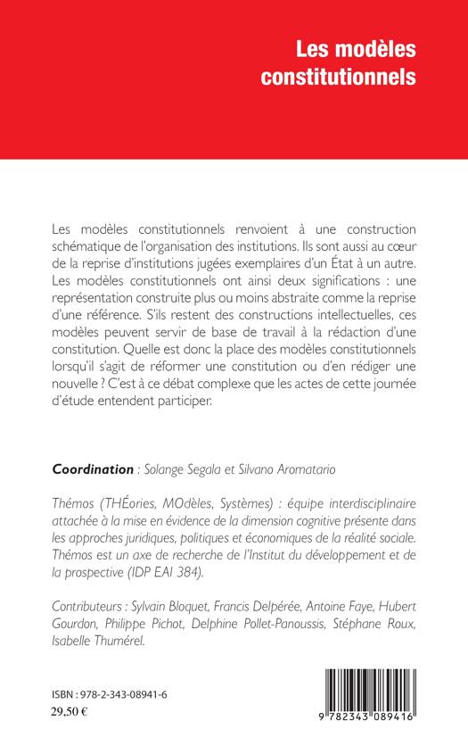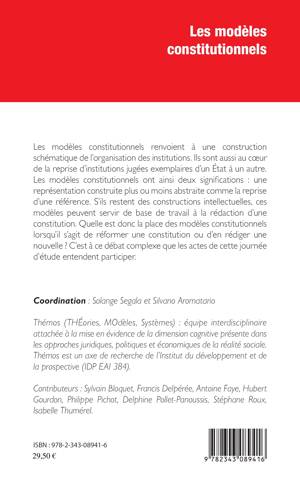 Les modèles constitutionnels renvoient à une construction schématique de l'organisation des institutions. Ils sont aussi au cur de la reprise d'institutions jugées exemplaires d'un État à un autre. Les modèles constitutionnels ont ainsi deux significations : une représentation construite plus ou moins abstraite comme la reprise d'une référence. S'ils restent des constructions intellectuelles, ces modèles peuvent servir de base de travail à la rédaction d'une constitution. Quelle est donc la place des modèles constitutionnels lorsqu'il s'agit de réformer une constitution ou d'en rédiger une nouvelle ?