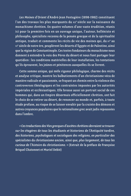 Les Moines d’Orient d’André-Jean Festugière (1898-1982) constituent l’un des travaux les plus marquants du XXe siècle sur la naissance du monachisme chrétien. En quatre volumes d’une vaste érudition, réunis ici pour la première fois en un ouvrage unique, l’auteur, helléniste et philosophe, spécialiste reconnu de la pensée grecque et de la spiritualité antique, traduit et commente les récits de vie des moines qui, du IVe au VIe siècle de notre ère, peuplèrent les déserts d’Égypte et de Palestine, ainsi que la région de Constantinople. Ces textes fondateurs du monachisme nous donnent à entendre la voix des Pères du désert et nous font partager leur quotidien : les conditions matérielles de leur installation, les tentations qu’ils éprouvent, les jeûnes et pénitences auxquelles ils se livrent.
