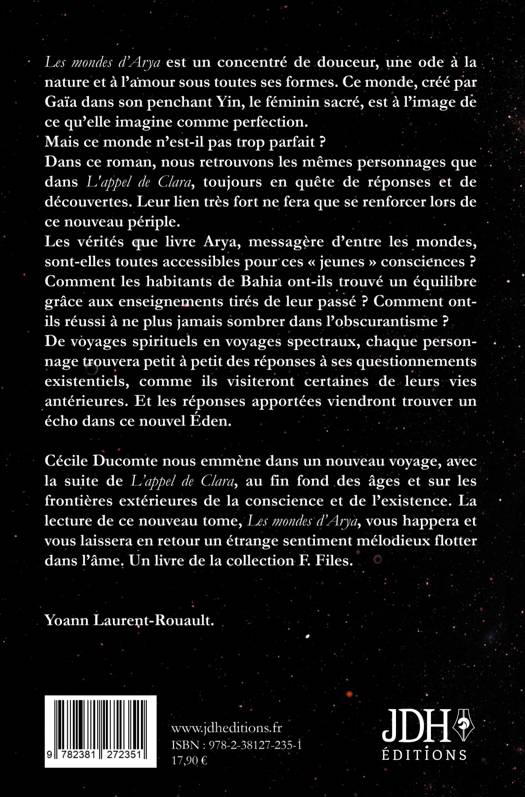 Les mondes d'Arya est un concentré de douceur, une ode à la nature et à l'amour sous toutes ses formes. Ce monde, créé par Gaïa dans son penchant Yin, le féminin sacré, est à l'image de ce qu'elle imagine comme perfection. Mais ce monde n'est-il pas trop parfait ? Dans ce roman, nous retrouvons les mêmes personnages que dans L'appel de Clara, toujours en quête de réponses et de découvertes. Leur lien très fort ne fera que se renforcer lors de ce nouveau périple. Les vérités que livre Arya, messagère d'entre les mondes, sont-elles toutes accessibles pour ces « jeunes » consciences ? Comment les habitants de Bahia ont-ils trouvé un équilibre grâce aux enseignements tirés de leur passé ? Comment ont-ils réussi à ne plus jamais sombrer dans l'obscurantisme ? De voyages spirituels en voyages spectraux, chaque personnage trouvera petit à petit des réponses à ses questionnements existentiels, comme ils visiteront certaines de leurs vies antérieures. Et les réponses apportées viendront trouver un écho dans ce nouvel Éden. Cécile Ducomte nous emmène dans un nouveau voyage, avec la suite de « L'appel de Clara », au fin fond des âges et sur les frontières extérieures de la conscience et de l'existence. La lecture de ce nouveau tome, « Les mondes d'Arya », vous happera et vous laissera en retour un étrange sentiment mélodieux flotter dans l'âme. Un livre de la collection F. Files. Yoann Laurent-Rouault