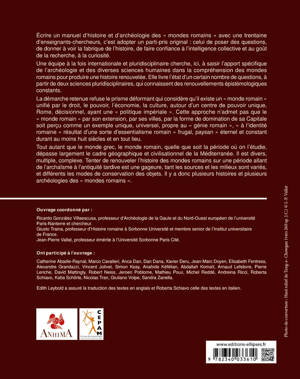 Une équipe à la fois internationale et pluridisciplinaire cherche, ici, à saisir l’apport spécifique de l’archéologie et des diverses sciences humaines dans la compréhension des mondes romains pour produire une histoire renouvelée. Elle livre l’état d'un certain nombre de questions, à partir de deux sciences pluridisciplinaires, qui connaissent des renouvellements épistémologiques constants.