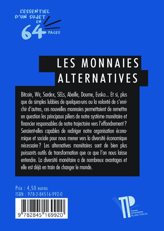 Bitcoin, Wir, Sardex, SELs, Abeille, Doume, Eusko... Et si, plus que de simples lubbies de quelques-uns ou la volonté de s'enrichir d’autres, ces nouvelles monnaies permettaient de remettre en question les principaux piliers de notre système monétaire et financier responsables de notre trajectoire vers l’effondrement ? Seraient-elles capables de rediriger notre organisation économique et sociale pour nous mener vers la diversité économique nécessaire ? Les alternatives monétaires sont de bien plus puissants outils de transformation que ce que l’on nous laisse entendre. La diversité monétaire a de nombreux avantages et elle est déjà en train de changer le monde.