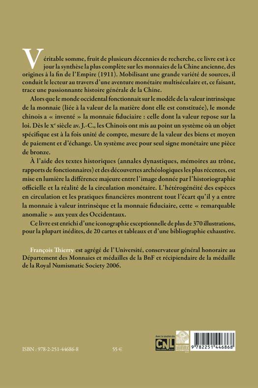 Veritable somme, fruit de plusieurs decennies de recherche, ce livre est a ce jour la synthese la plus complete sur les monnaies de la Chine ancienne, des origines a la fin de l'Empire (1911). Mobilisant une grande variete de sources, il conduit le lecteur au travers d'une aventure monetaire multiseculaire et, ce faisant, trace une passionnante histoire generale de la Chine. Alors que le monde occidental fonctionnait sur le modele de la valeur intrinseque de la monnaie (liee a la valeur de la matiere dont elle est constituee), le monde chinois a invente la monnaie fiduciaire: celle dont la valeur repose sur la loi. Des le xe siecle av. J.-C., les Chinois ont mis au point un systeme ou un objet specifique est a la fois unite de compte, mesure de la valeur des biens et moyen de paiement et d'echange. Un systeme avec pour seul signe monetaire une piece de bronze. A l'aide des textes historiques (annales dynastiques, memoires au trone, rapports de fonctionnaires) et des decouvertes archeologiques les plus recentes, est mise en lumiere la difference majeure entre l'image donnee par l'historiographie officielle et la realite de la circulation monetaire. L'heterogeneite des especes en circulation et les pratiques financieres montrent tout l'ecart qu'il y a entre la monnaie a valeur intrinseque et la monnaie fiduciaire, cette remarquable anomalie aux yeux des Occidentaux. Ce livre est enrichi d'une iconographie exceptionnelle de plus de 370 illustrations, pour la plupart inedites, de 20 cartes et tableaux et d'une bibliographie exhaustive.