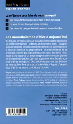 Le judaïsme, le christianisme et l’islam partagent la même croyance en un dieu unique. Leur héritage a façonné notre civilisation. Reprenant quatre numéros - actualisés par leurs auteurs - de la documentation photographique, cet ouvrage propose une histoire scientifique et critique des trois religions monothéistes qui comptent plus de 3 milliards de fidèles dans le monde. Les monothéismes et les croyances, en tant que faits religieux, sont aussi des objets historiques et leur étude sur un temps long permet de mieux comprendre les enjeux contemporains. Que nous apprennent leurs évolutions, de leurs origines à nos jours ? Cinq historiens apportent des éléments de réponse. Clairement présenté, avec de nombreuses illustrations (cartes, fac-similés, photographies...), c’est un document utile pour une meilleure compréhension de ces religions.