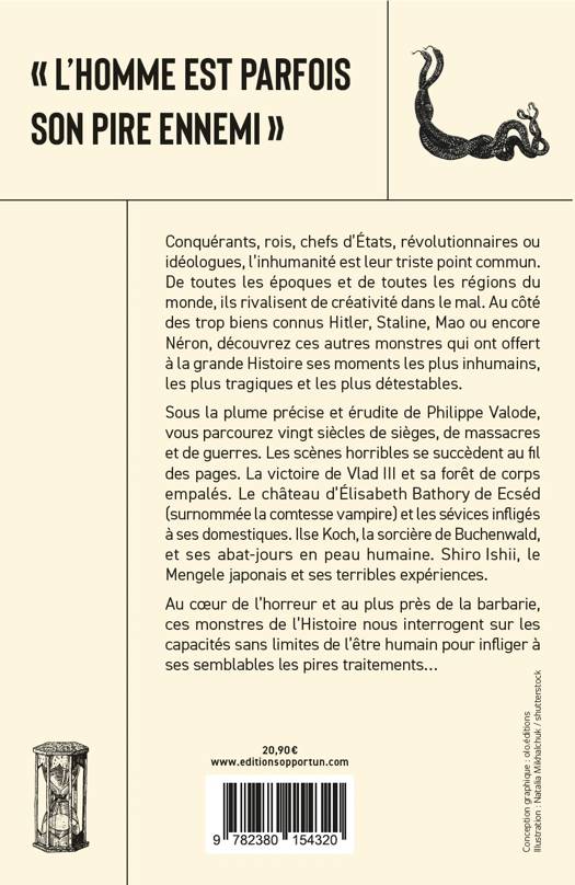 Conquérants, rois, chefs d'États, révolutionnaires ou idéologues, l'inhumanité est leur triste point commun. De toutes les époques et de toutes les régions du monde, ils rivalisent de créativité dans le mal. Au côté des trop biens connus Hitler, Staline, Mao ou encore Néron, découvrez ces autres monstres qui ont offert à la grande Histoire ses moments les plus inhumains, les plus tragiques et les plus détestables.