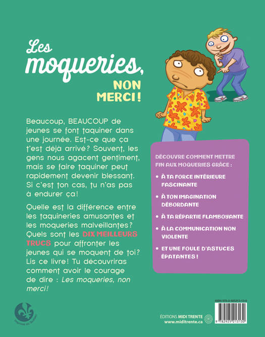 Beaucoup, BEAUCOUP de jeunes se font taquiner dans une journée. Est-ce que ça t’est déjà arrivé ? Souvent, les gens nous agacent gentiment, mais se faire taquiner peut rapidement devenir blessant. Si c’est ton cas, tu n’as pas à endurer ça ! Quelle est la différence entre les taquineries amusantes et les moqueries malveillantes ? Quels sont les dix meilleurs trucs pour affronter les jeunes qui se moquent de toi ? Lis ce livre ! Tu découvriras comment avoir le courage de dire : "Les moqueries, non merci !" Destiné aux jeunes de 6 ans et plus, Les moqueries, non merci ! est un guide rempli d’humour, d’illustrations rigolotes et de trucs pratiques pour leur donner le courage de s’affirmer et pour éviter de se faire intimider. À la fin du livre sont proposées des activités complémentaires pour apprendre aux jeunes à contrôler leurs réactions, à reprendre le contrôle des situations difficiles et à mettre fin aux moqueries dans leur vie.